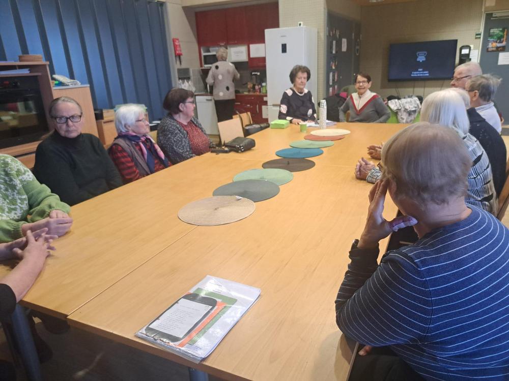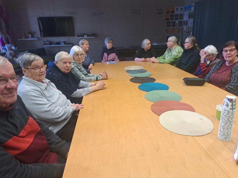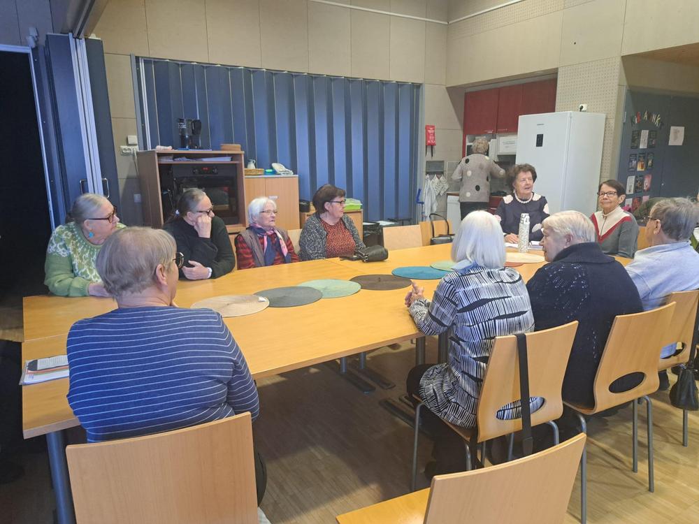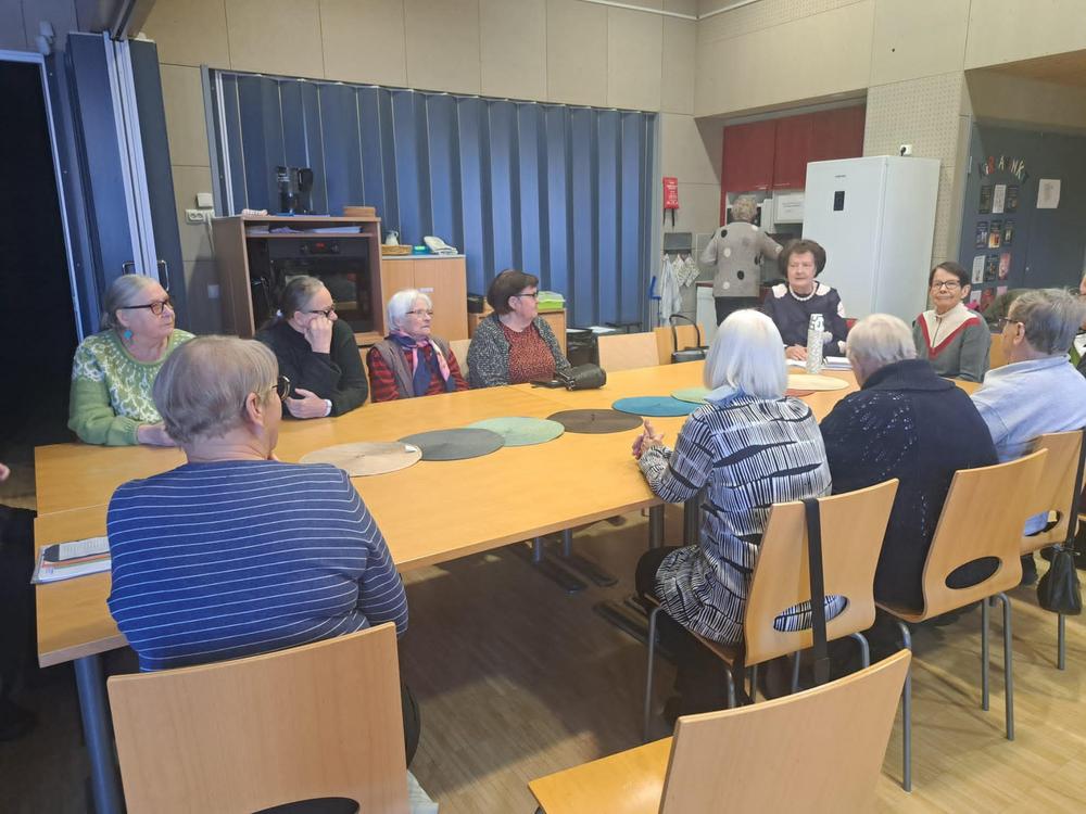 Kerhon toiminnasta: Aloitamme kerhon laittamalla kahvin porisemaan. Siinä sitten kahvin poristessa laulelemme vanhoja koululauluja tai kansanlauluja ja luen jonkun päivän aiheeseen sopivan runon tai tekstin. Kahvin ja leivonnaisten kera vaihdamme kuulumisia ja tärkeimpiä päivän uutisia. Syyskauden alussa oli täällä päin paljon sairaana ihmisiä ja ihmiset vaihtuivat, joten kolme ensimmäistä kokoontumista meni ihan vaan; mitä kuuluu, kuinka olette voineet, kuinka kesä meni. Seuraavalla kerralla keskustelimme terveysasioista. Sitten oli aiheena: Koti, johon synnyit ja kodit, joissa olet elämäsi aikana asunut ja millaisessa kodissa nyt asut? Onhan meidän ikäisten aikana asumisoloissa tapahtuneet suuret muutokset. Tämä aihe osoittautui niin mielenkiintoiseksi muistelemiseksi, että meiltä meni kolme kokoontumiskertaa, että jokainen pääsi muistelemaan. Mielenkiintoisia tarinoita. Vilkasta mielipiteiden vaihtoa. Sittenpä olikin syyskauden viimeinen kokoontuminen ja aiheena tietenkin joulu.