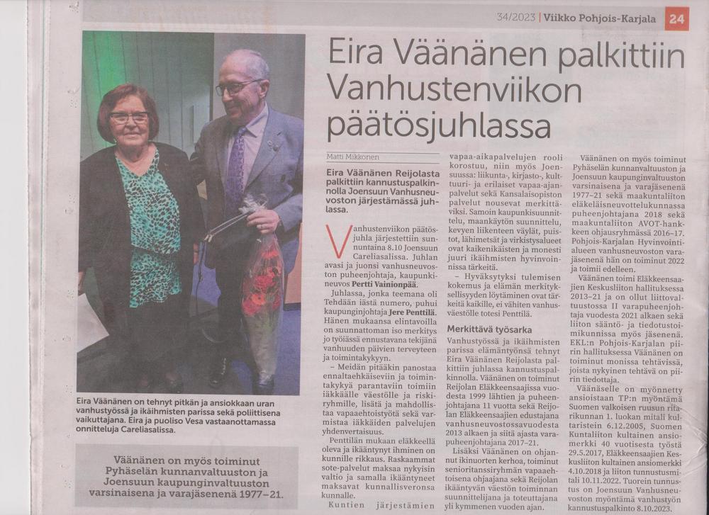 Eira Väänänen sai vuoden 2023 vanhustyön kannustuspalkinnon.